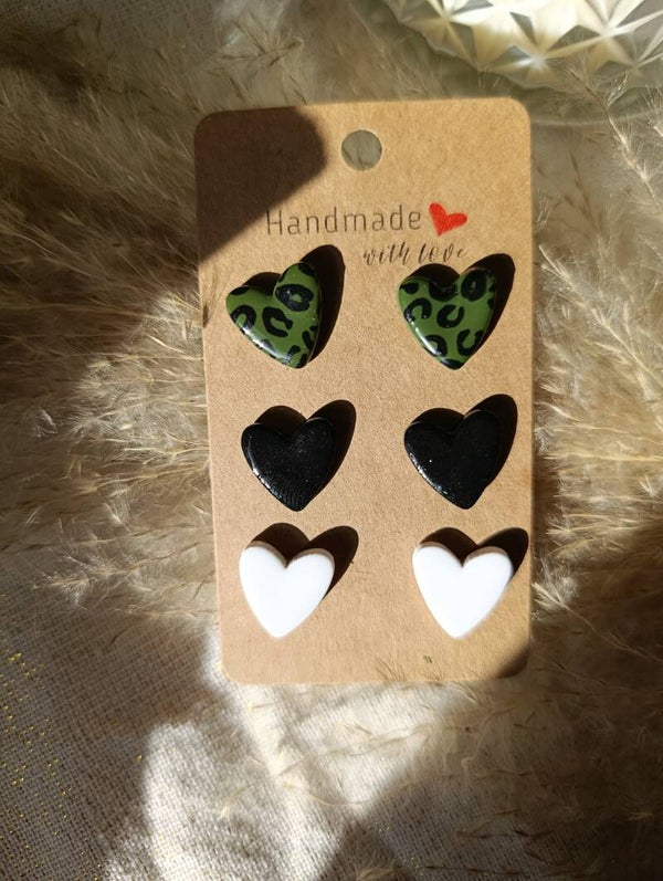 Les petites puces d'oreilles en forme de coeurs Les trois paires sont en argile polymère de couleur mauve et rose pâle.