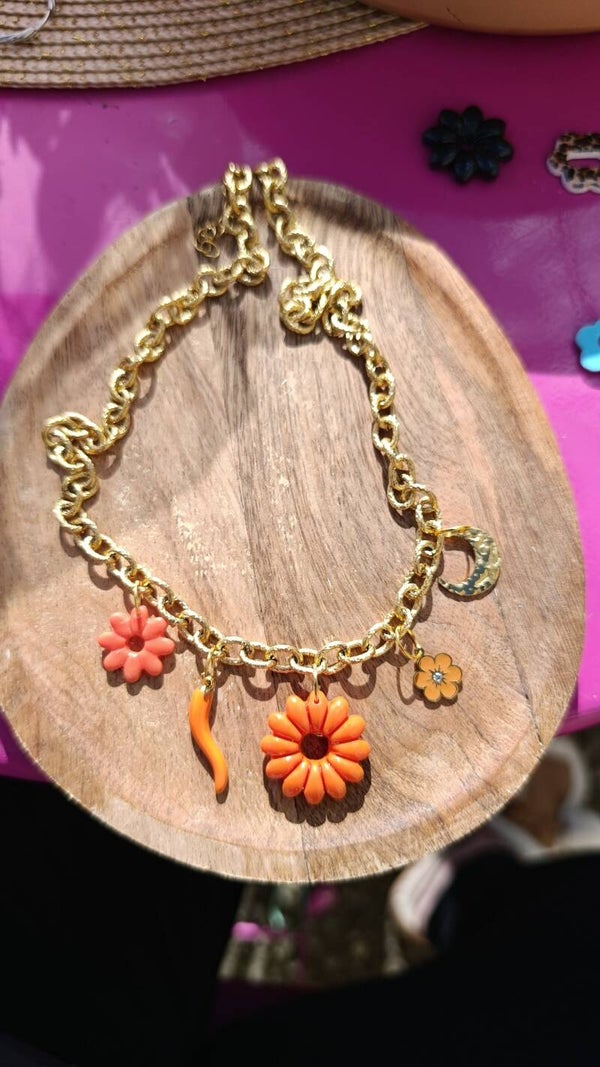 Petit collier au couleur printanière et pétillante, qui mélange des pampilles sur les tons de jaune et vert. Et des des breloques en acier inoxydable.